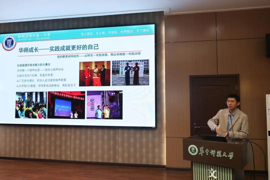 接着牛杰介绍了所在的呼市一中的学校概况、办学情况,以及呼市一中招聘的公费师范生职业发展情况,他结合自身工作经历谈教师专业化发展路径,从听课、改革、创新、担当四个方面阐释教师素养与教育情怀,鼓励同学们发挥特长、积极探索、勇于担当。