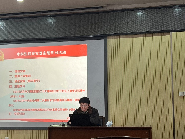 首先,由本科生院朱强领学习近平总书记在学习贯彻党的二十大精神研讨班开班式上重要讲话精神,习近平总书记在该次讲话中强调,要正确理解和大力推进中国式现代化,深入阐释了中国式现代化理论,指出中国式现代化是党的二十大的一个重大理论创新,是科学社会主义的最新重大成果。随后,本科生院李思文领学习近平总书记在中共中央政治局第二次集体学习时的重要讲话精神,阐述了加快构建新发展格局的重大现实意义和深远历史意义,我们要结合学校实际,在推动学校事业高质量发展,在服务和融入新发展格局上展现更大担当和作为。其次,曾艳梅副书记领学了湖北省违规吃喝问题专项整治工作方案等文件精神,并结合近期开展的专项工作,向全体党员通报了支部开展专项整治工作的相关情况,要求全体党员同志要以身作则,高度重视,强化正风肃纪,锲而不舍的落实中央八项规定精神,全面推进从严治党。