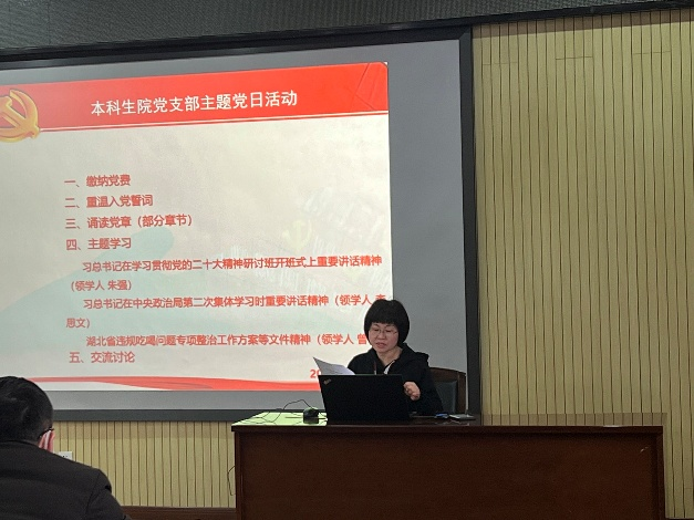 2023年3月3日下午,本科生院党支部在行政楼二楼会议室组织召开2月份支部主题党日活动,本科生院曾艳梅副书记主持,全体党员参加。