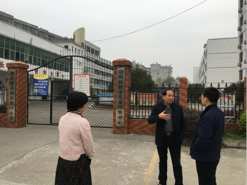 (图为雷院长、曾局长与第四小学校长在留守儿童托管中心门前交流)
