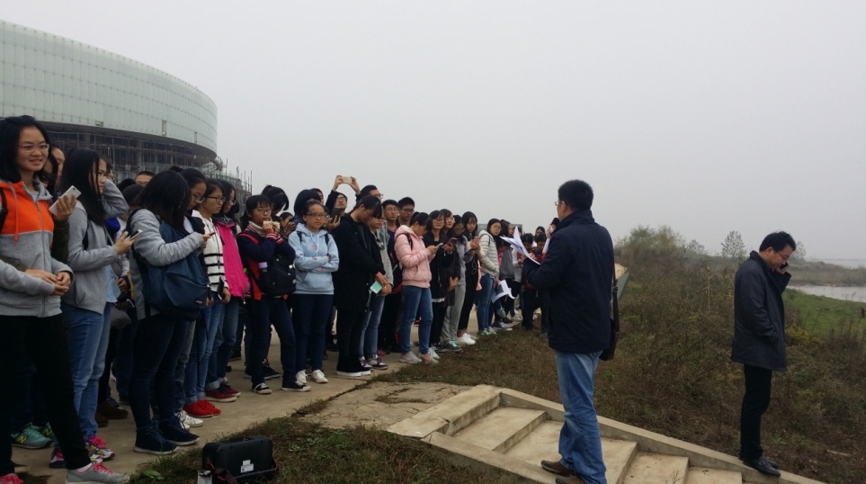 2016年11月20日上午,城环学院2016级新生近200人,在地理科学专业系主任揭毅老师、自然地理与资源环境专业系主任张海林老师、2016级辅导员张喆老师、本科教学秘书朱强老师以及实验员杨毅老师的带领下,前往鄂州梁子湖区的“东湖高新科技创意城”、“湖泊展示馆(在建)及牛山湖大堤”、“鄂州华师新校址”以及“美丽乡村建设试点张家湾”4个地点进行实地的见习。经过前期与梁子湖区政府的沟通协调,地方政府对本次考察给予了大力支持,安排有区管委会董军主任等专人进行讲解。