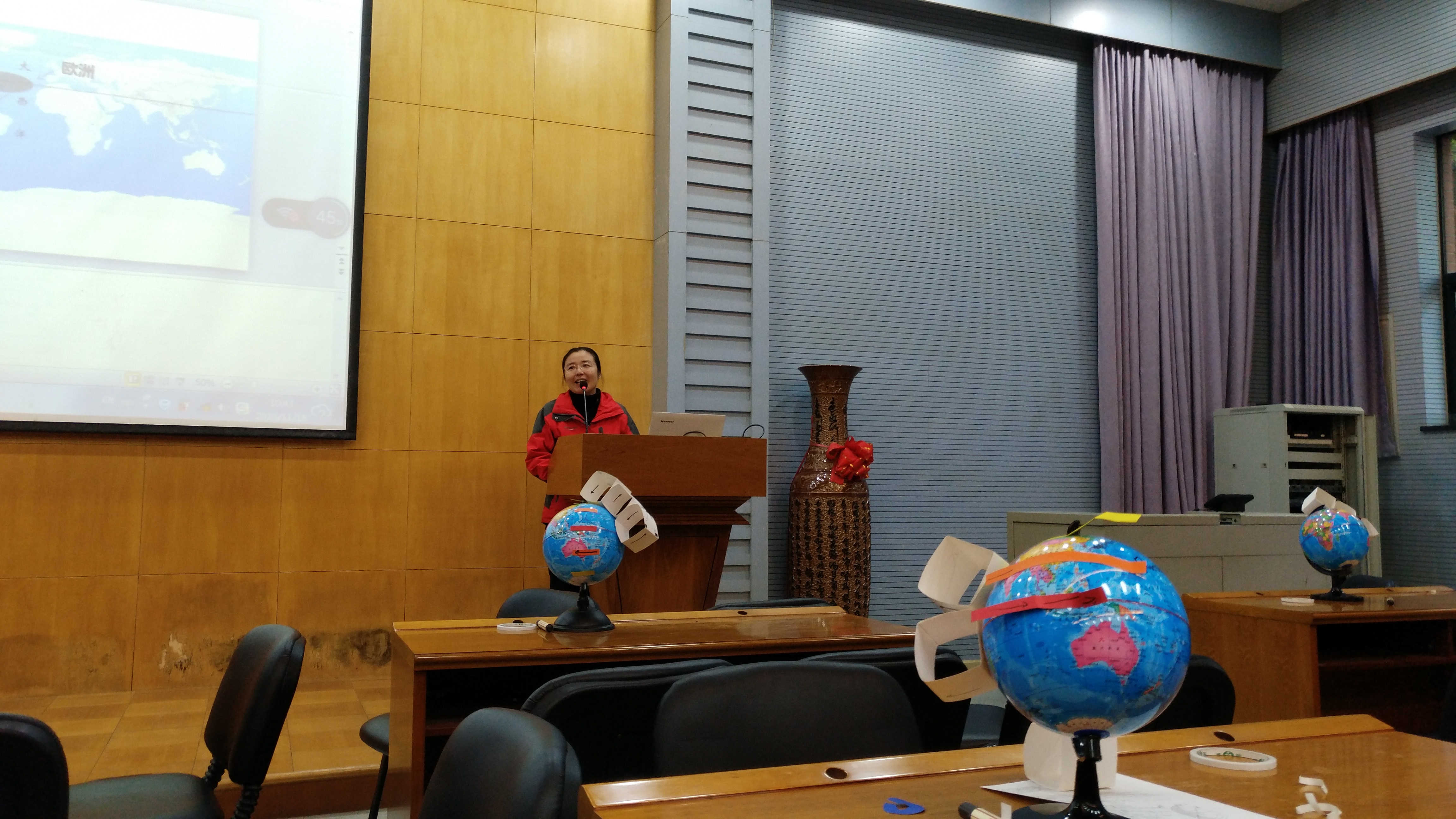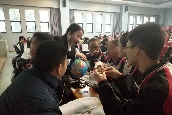 本节公开课的选题是《气压带和风带》。上课伊始,主讲教师马丽娟以“马纬度”故事的进行课堂导入,有趣的故事很快便抓住了学生的注意力。在授课过程中,她与学生们一同用立体图模型推导三圈环流形成过程,帮助学生建立地理空间的概念。公开课中最为精彩的环节当数“模拟气压带与三圈环流”的实验:高一(1)班的学生们在老师的指导下,用彩色纸条和白色纸环分别代表气压带和环流圈,用碳素笔将气流的运动方向标在白色纸环上并将其贴在地球仪上相应的位置。学生们分成11个小组,围绕各自的地球仪积极行动起来。整个课堂氛围热烈,学生们认真思考、踊跃发言,一堂充分体现学生主体的地理课在学生们的意犹未尽之中结束了。