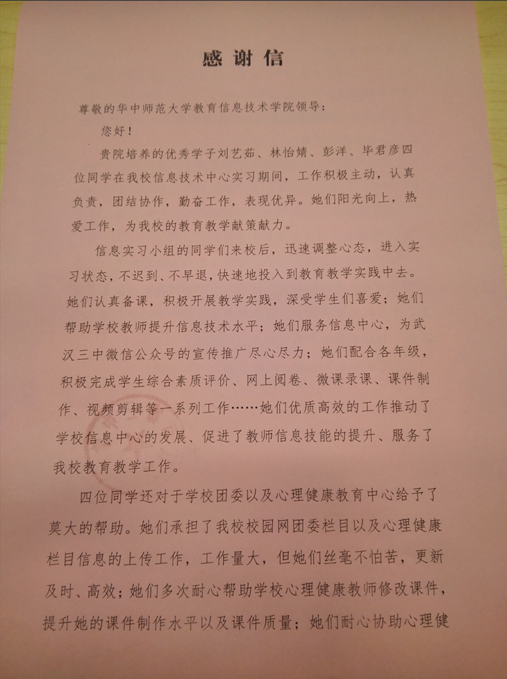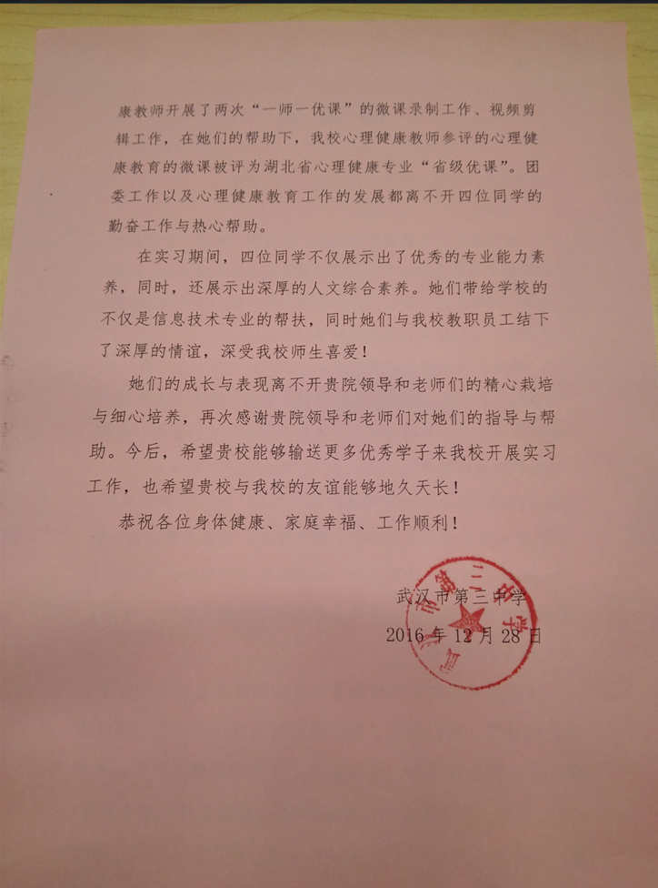 信技学院2013级师范生教学实习工作已经顺利完成,该院学子以扎实的学科知识和优良的工作作风得到了广大实习单位的好评。近日,信技学院收到了武汉市第三中学发来的感谢信,感谢该院为其输送了刘艺茹、林怡婧、彭样和毕君彦等四位优秀实习生。