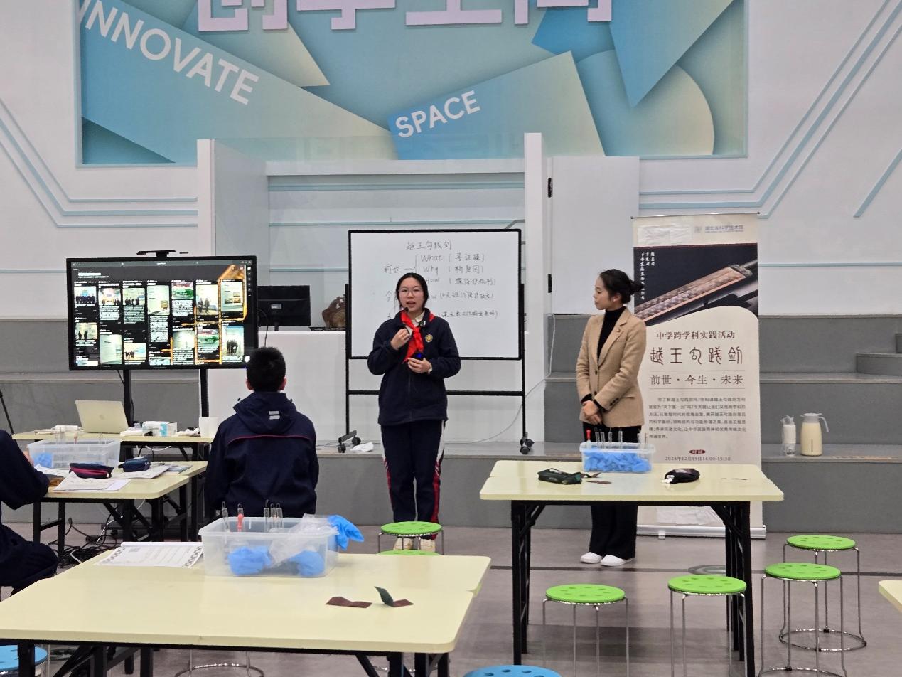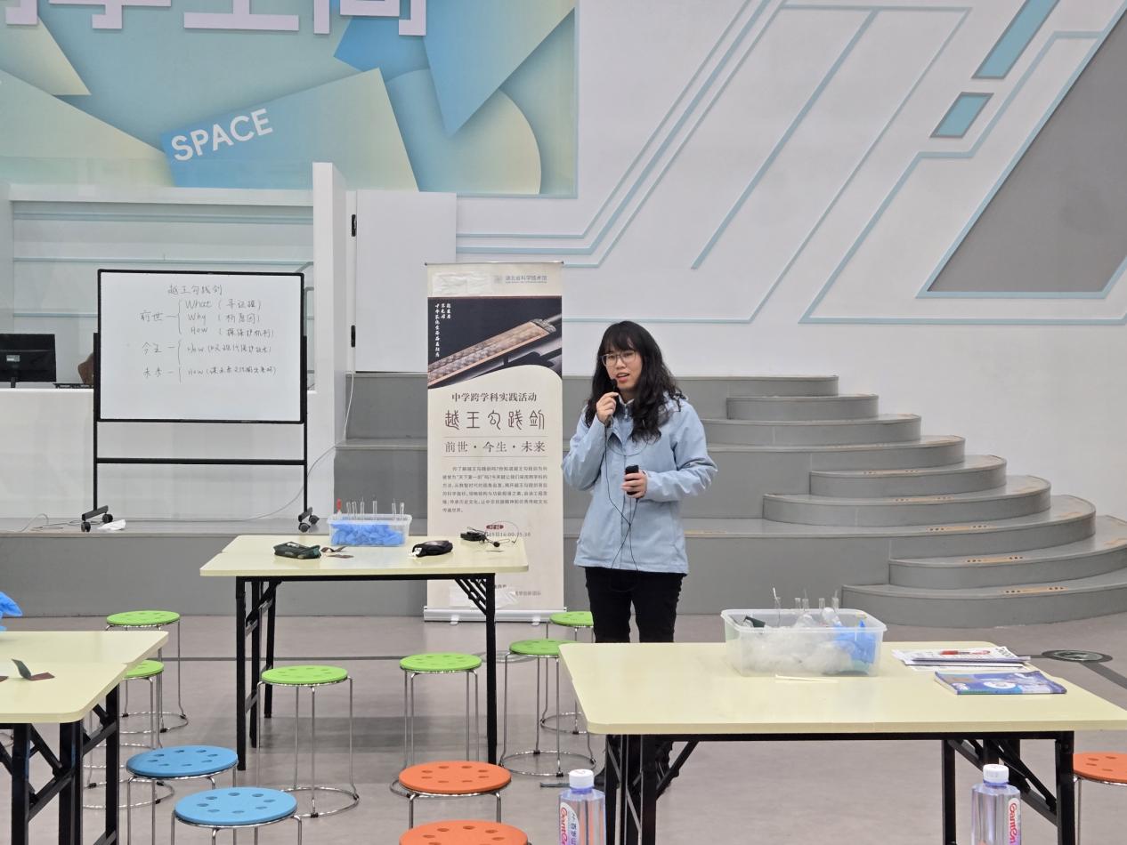 活动中师祚琳同学展示了如何以跨学科大观念统领化学、历史和物理等多科学知识与技能的融合,以探秘寻求证据的方式,引导中学生走近科技馆中的多个展项,培养学生解决问题的一般思路与方法,从文物保护的视角弘扬中华优秀传统文化,强化中学生文化传承与发展的责任感,以中国科学院/工程院院士作为榜样,激励中学生成为科技创新接班人。