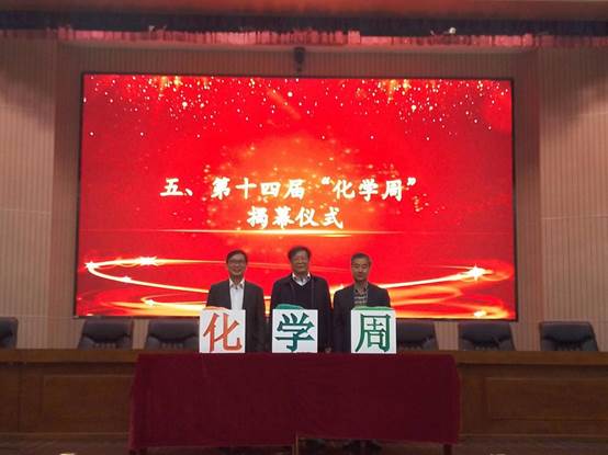 刘买利、任友洲和肖文精共同开启了化学周的揭幕仪式。随着嘉宾们将锥形瓶中的碘化钾溶液倒入,三个容器上的“化学周”镂空字样因化学反应而呈现出红、蓝、绿三种不同颜色。其中,红色象征传承红色基因,蓝色代表永不言弃的精神,绿色凸显传承与创新。三种鲜艳亮丽的颜色,共同展现着化学人将秉持化学周的精神,砥砺前行,续写辉煌。