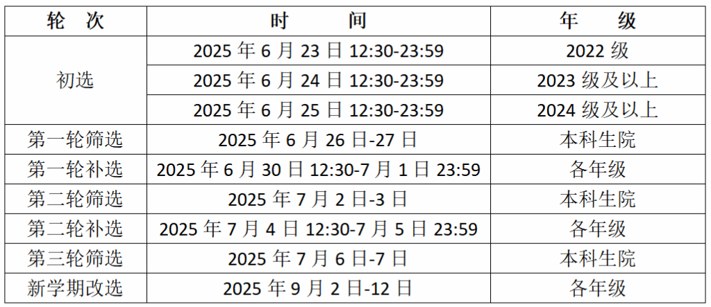 按照学校教学工作安排,现发布选修2025-2026学年第一学期课程的通知,具体选课安排如下:本次选课分为六个阶段,初选——第一轮筛选——第一轮补选——第二轮筛选——第二轮补选——第三轮筛选。具体时间见下表: